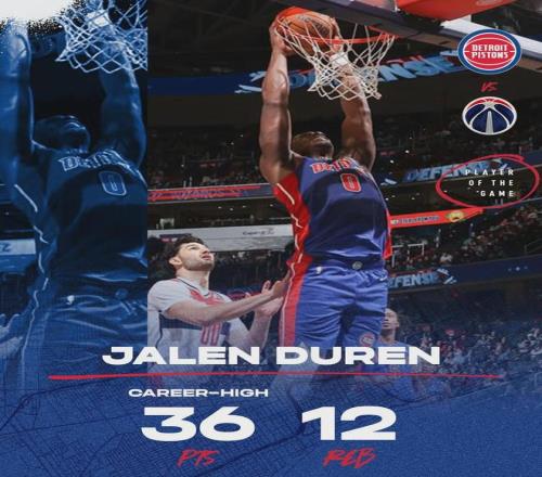 如今随着坎宁安无限期休战,活塞核心中锋杜伦将扛起重任,这位22岁猛男,本赛季至今场均出战27.8分钟就能贡献19分10.6板1.7助,投篮命中率64.2%高居联盟第三,同样在今年入选了全明星阵容。