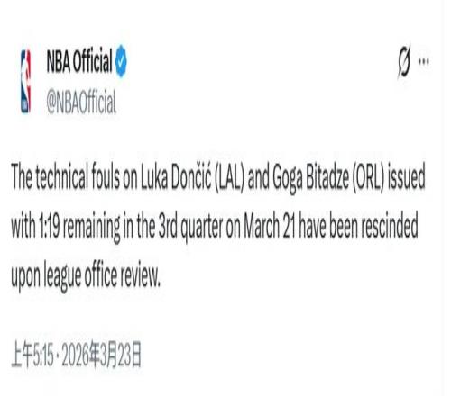 NBA宣布:撤销东契奇的第16次技术犯规。