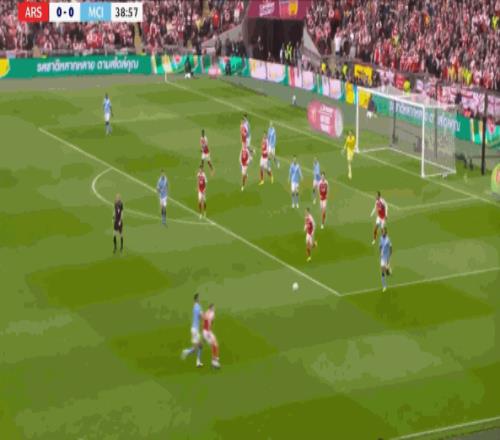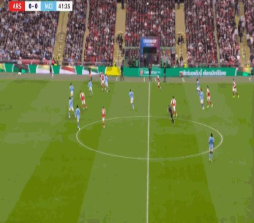 于是随着时间的推移,实际上已经是曼城越打越好了,比如在第39分钟,曼城这次先分右边,把特罗萨德和因卡皮耶都拽过去之后,罗德里就从哲凯赖什和哈弗茨之间穿出来,在无人区域带球向前,形成了对阿森纳的威胁: