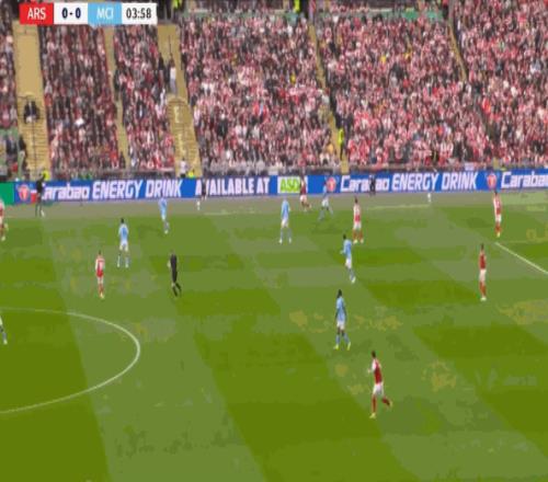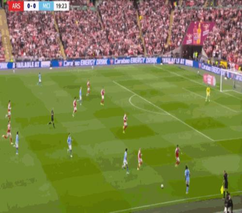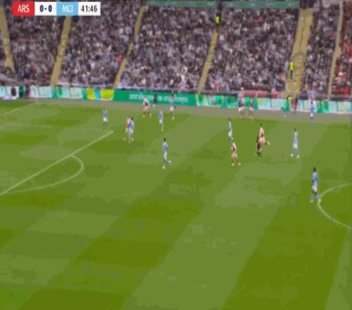 曼城通过右路打出优势,阿森纳在场上的形势就开始转而被动,因为在队形被压回去之后,阿森纳变得很难弹出,比如这次反击,哈弗茨和赖斯就在冲击中没能做好:
