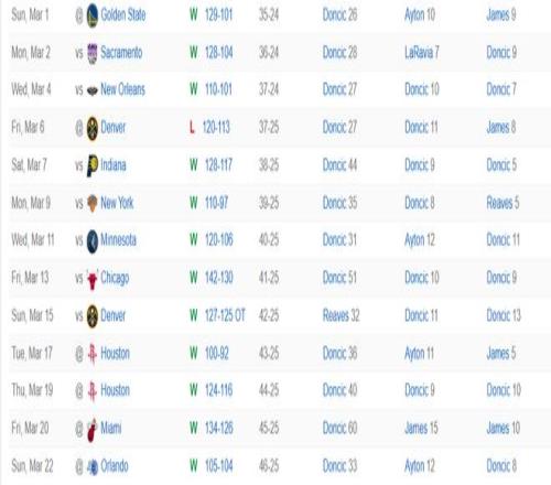 湖人目前正值一波九连胜,东契奇场均出战 37.5 分钟,拿到 40 分 8.4 篮板 7.4 助攻 2.6 抢断 0.9 盖帽,投篮命中率 49%,三分命中率 40.3%。他成为张伯伦后首位9连胜期间能场均拿到至少40分以上的球员。