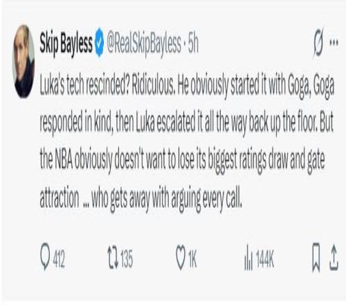 ‘金牌詹黑’斯利普-贝勒斯对东契奇被取消技犯很不满,他表示:卢卡的技术犯规被取消了?太荒谬了,明显是东契奇先挑衅比塔泽的,比塔泽只是以牙还牙而已,之后东契奇还一路升级冲突。NBA为了票房、收视率对每个吹罚都有自己的解释方法。
