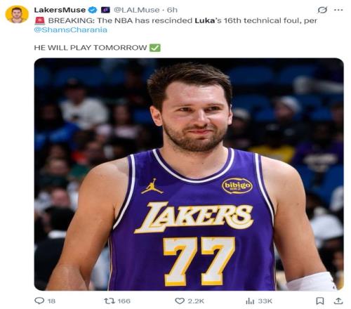 北京时间3月23日,根据ESPN名记Shams的报道,东契奇在对阵魔术时的技术犯规被取消,比塔泽的技术犯规也被取消,如此一来东契奇积累技术犯规还是15个,他能出战对阵活塞的比赛。