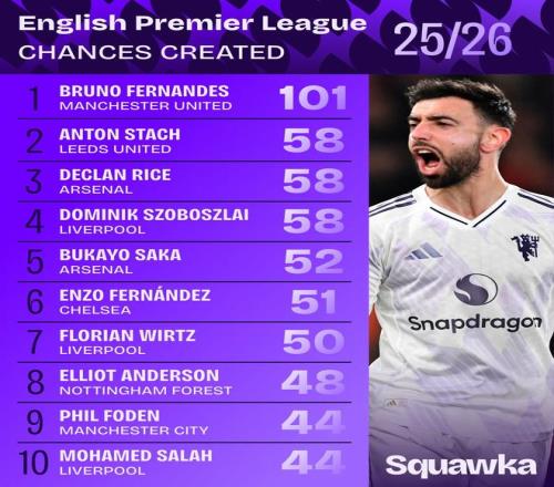 近日,知名数据机构Squawka发布了本赛季截至目前的英超创造机会榜。曼联中场布鲁诺-费尔南德斯以创造101次机会遥遥领先该榜单。