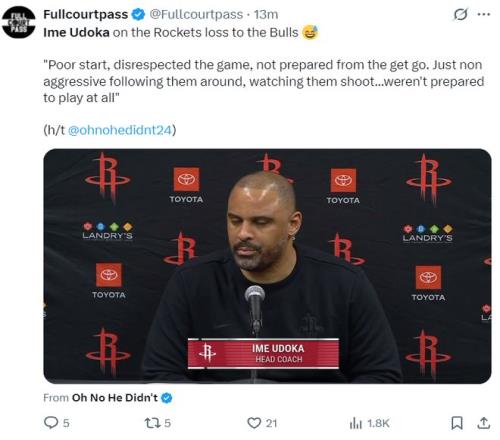 休媒谈到这场比赛的失利:杜兰特40分火箭生涯最高分,申京19中16拿到33+13+10,我真的不敢相信输给公牛这种球队 ,他们过去25场只赢了5场吧。