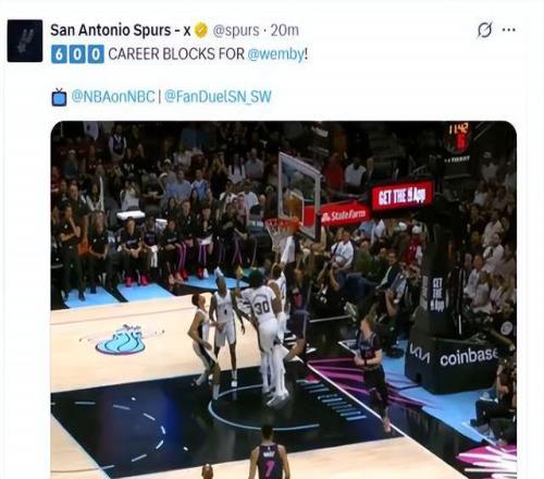 进入比赛第二节,文班亚马再次完成多项历史里程碑: