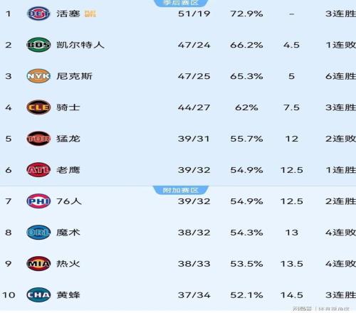 当前,在东部常规赛战绩上排在猛龙队前面的球队分别是活塞队(51胜19负)、凯尔特人队(47胜24负)、尼克斯队(47胜25负)和骑士队(44胜27负)。