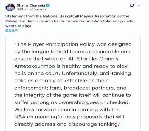 球员工会在周三的声明中援引了NBA的反摆烂条例,并明确表示字母哥身体健康、具备出战条件。